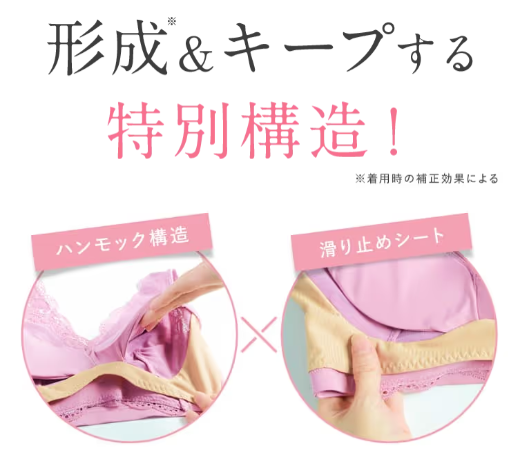 バージスラインの周囲を囲むのは滑り止め加工を施した特殊な生地。胸のお肉を寄せて集めることで整えたバージスラインを、逃さずキープします。ワイヤーは使用していないので、就寝中も快適です。