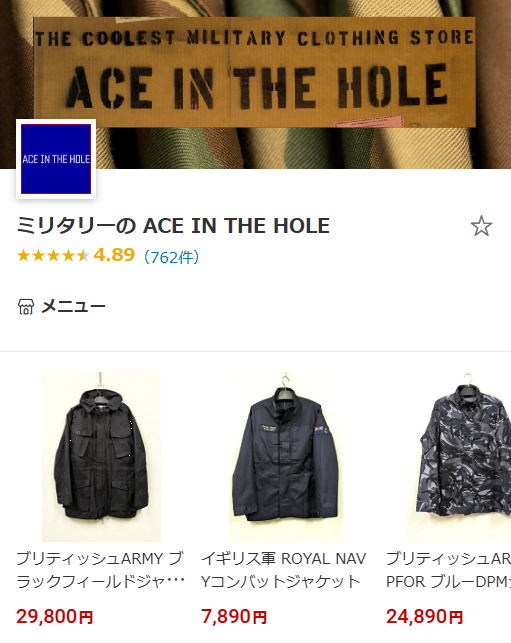 ミリタリーのACE IN THE HOLEは、「古着やミリタリーが今まであまりお好きでなかったという方にも気軽にミリタリーウェアまたはグッズをお楽しみいただけるよう」をポリシーに運営されているショップです。個人的にとてもおすすめなショップ。理由として、物に対しての値段が安いです。そして、コンディションがいい物が多いため、あまり古着が得意ではないといった方でも抵抗なく着る事が出来るデットストックの商品を見つけやすいです。楽天市場みんなのレビューの評価も4.82とかなり高いので、安心して使う事ができるでしょう。また楽天市場店だけで、なくヤフーショッピング、Amazonにも出店しているのでいつも使っている通販で買うことが出来るの嬉しいポイントです。ECWCSの取り扱いもあります。