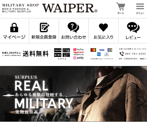 WAIPERは、福岡にあるミリタリーショップでおしゃれな外観の店舗を持っています。そして通販サイトは、つい買ってしまいそうになるデザインが特徴の使いやすい通販サイトで大変オススメ。楽天市場店の評価も星4.36(2019年1月現在)と好評価。WAIPERも世界各国のミリタリー放出品・実物を買うことが出来ます。特にセールを頻繁に行っていたり、B品(アウトレット品)を販売していたり安く買うための施策を多くやっています。商品の解説も豊富に書いていたり、試着代行サービスでサイズ感を掴みやすかったりとアイテムやサイズ感がわからないミリタリー初心者でも買いやすい通販サイトです。しかし、その半面WAIPERオリジナルのレプリカも取り扱いも多い放出品の品数は、少ないのでミリタリー好きの方には、物足りないショップだと思います。ECWCS取り扱いあり。