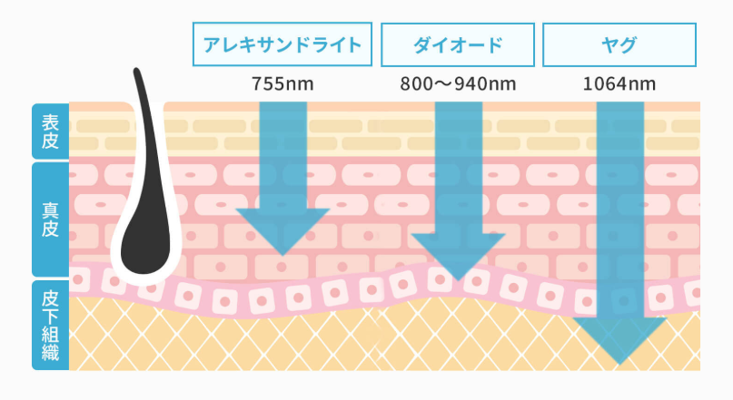 可能な限り少ない回数で、効率的に脱毛を進めるためには、自分の肌質・毛質に合った脱毛機を導入しているかをチェックすることが重要です。レーザー波長