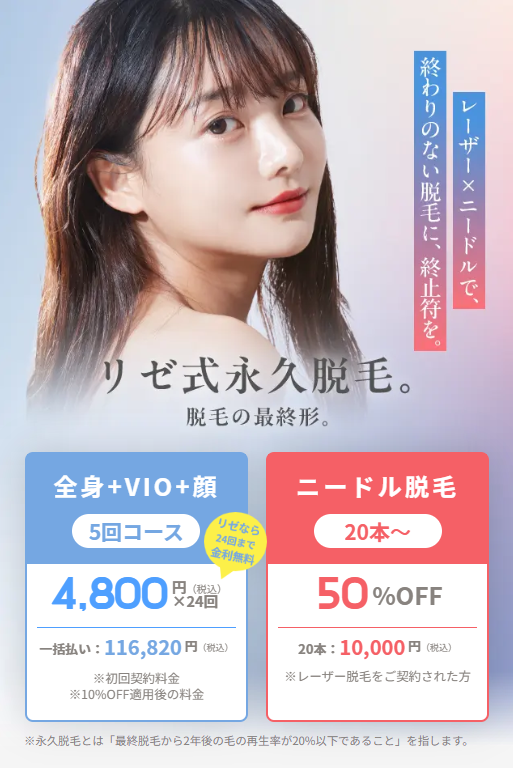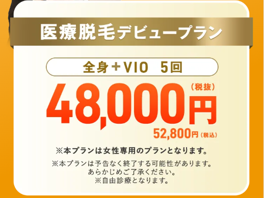 | 脱毛プラン: | ・全身脱毛(顔・VIO含む) 5回:424,000円(税込) ・全身脱毛(VIO含む) 5回:52,800円(税込) ・全身脱毛(顔・VIOなし) 5回:216,000円(税込) |