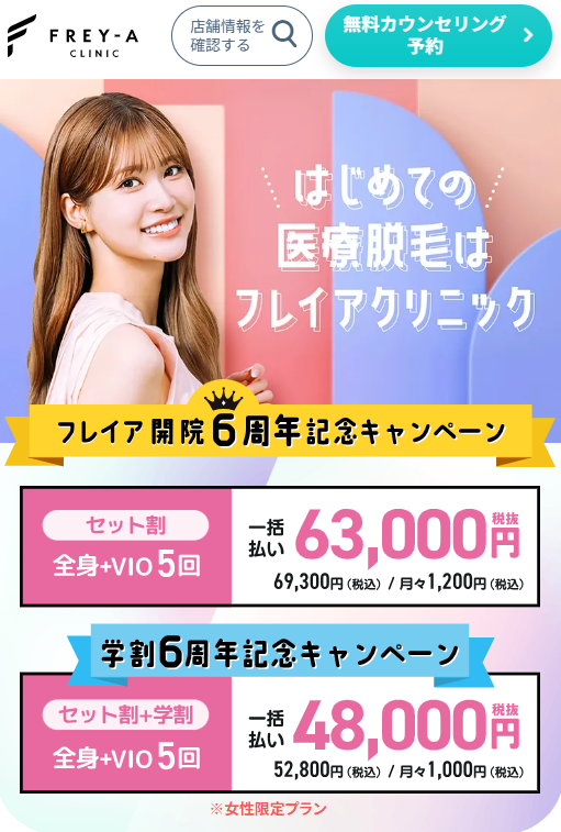 「フレイアクリニック」は蓄熱式と熱破壊式が毎回選べる脱毛機を採用しているクリニックです。
