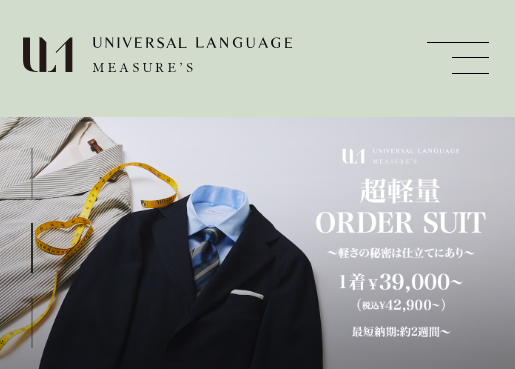 UNIVERSAL LANGUAGEでは独自のルートで国内外のブランドから上質な生地を調達しており、また、豊富な種類の型紙の中の計100万通りのバリエーションの中から自身に合った最高の一着を作成することができます。具体的な型紙の種類としては、「ナポリモデル」「ミラノモデル」「ブリティッシュモデル」「モードモデル」「タキシード」の中から選ぶことができます。また、出張オーダーサービスでは、希望の時間や場所に採寸見本服、生地サンプル、オプションパーツ一式を持参したスタッフが向かい店舗で行うのと同様にオーダースーツを利用できます。