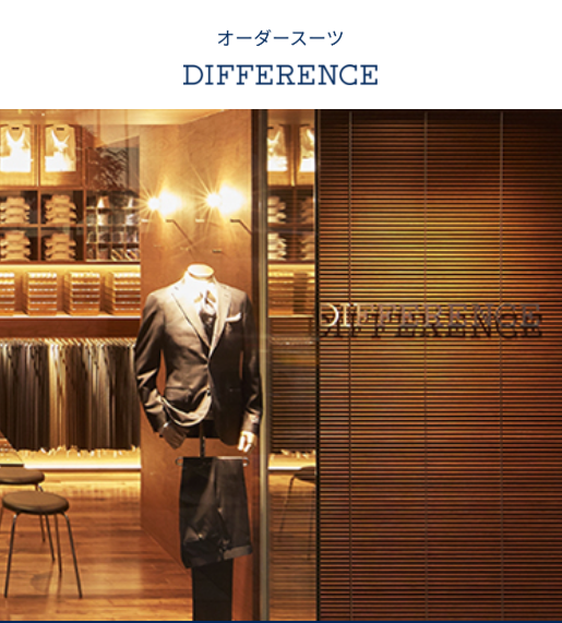 DIFFERENCEは①良質な生地を提供する仕組み②最短1週間の迅速なサービス③は低価格のプライスラインの3つの大きな特徴があるオーダースーツ店です。