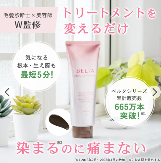 実績が認められて大手百貨店でも販売・全国738の医療機関、50以上の自治体と連携しているBELTAが送るヘアカラートリートメントです。一般的な白髪染めに多い、染めることによって髪や頭皮が傷んでまた白髪が増える…という悪循環を断ち切るために誕生した、キューティクルを開かずうるおう艶黒髪を目指せるのが特徴。やさしく・美しく白髪をケアします。
